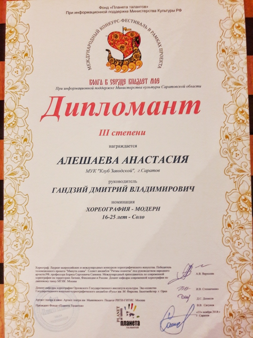 10 ноября 2018г участница студии танца «ART mix» МУК «Клуб «Заводской» Анастасия Алешаева в Международном конкурсе-фестивале в рамках проекта «Волга в сердце впадает моё» в номинации «Хореография — МОДЕРН» заняла диплом Дипломанта III степени!!!